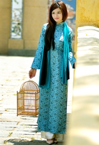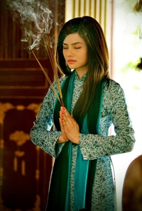 | Trong bộ áo dài tha thướt, Vũ Thu Phương thành tâm tìm về cửa Phật. |