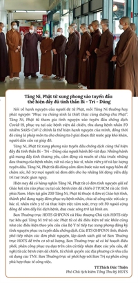 Hòa thượng cũng thân thiết căn dặn, lưu ý mỗi người phải nghiêm túc chấp hành các nguyên tắc bảo vệ sức khỏe cho bản thân, tích cực hỗ trợ các y bác sĩ khi được phân công. Chính những quan tâm sâu sát của lãnh đạo Phật giáo tỉnh là nguồn động viên lớn lao để mỗi tình nguyện viên cố gắng mỗi ngày, hoàn thành nhiệm vụ hỗ trợ y bác sĩ chăm sóc bệnh nhân Covid, lấy mẫu xét nghiệm trong cộng đồng trên địa bàn 3 phường thuộc TP.Thủ Dầu Một.