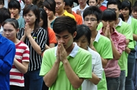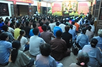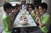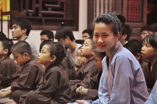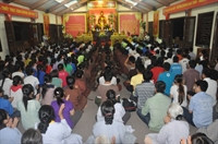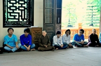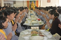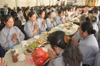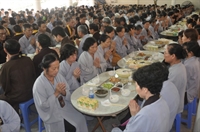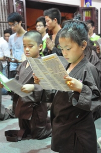 Các bạn trẻ cùng tham gia nghi lễ cúng ngọ với các Phật tử trong đạo tràng