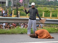 Đại đức Thích Tâm Mẫn hành lễ trên quốc lộ 1A.