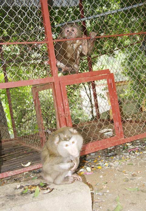con khỉ bị nhốt trong lồng sắt. Một tay buôn khỉ định chuyển đi Trung