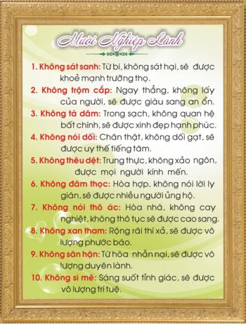 - 4 nghiệp về miệng (tức về khẩu ngữ) : không nói dối, không nói lưỡi hai chiều, không nói ác khẩu, không nói lời thêu dệt,