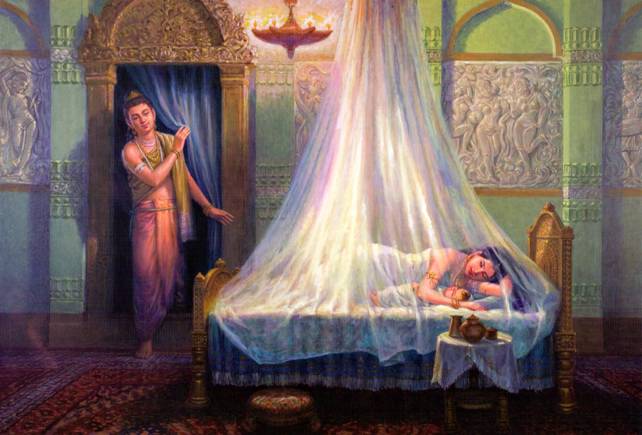Ngài truyền lệnh cho Channa, người đánh xe yêu chuộng, thắng yên ngựa Kaṇṭhaka và thẳng đến điện của công chúa. Ngài khẽ hé cửa nhìn vợ và con đang yên giấc với một tấm lòng từ ái nhưng bình thản, không chao động, không trìu mến. Tình thương đối với vợ, con thật mặn nồng sâu sắc. Nhưng đối với nhân loại trầm luân đau khổ, lòng trắc ẩn của Ngài lại càng thâm thậm vô ngần. Ra đi, Ngài không lo sợ cho tương lai của công chúa và hoàng tử, vì biết chắc chắn rằng vợ và con sẽ có đầy đủ tiện nghi và đảm bảo để sống an toàn và sung sướng. Ra đi, không phải vì kém tình thương vợ, thương con, mà vì tình thương của Ngài mở rộng cho mọi người, bao trùm tất cả nhân loại và chúng sanh.