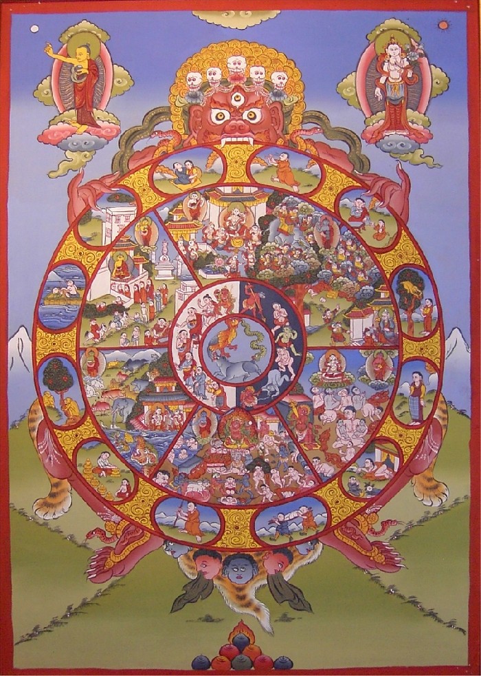 Vòng ngoài cùng của bánh xe luân hồi (bhavacakra) được tượng bằng 12 hình ảnh (xem hình). Tuy nhiên trong khuôn khổ tìm hiểu sự vận hành của nghiệp đưa đến sự tái sinh thì chúng ta chỉ cần quan tâm đến ba mối dây nhân-duyên (nidana) đầu tiên cũng đủ giải thích tại sao chúng ta lại đang hiện hữu trong cảnh huống như thế này. Ba mối dây ấy như sau :