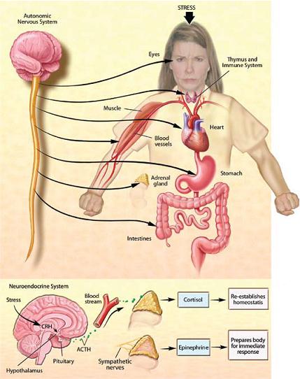 'Adrenaline làm cho tim và bắp thịt gia tăng hoạt động. Hệ đối giao cảm vận hành làm tiết ra chất acetylcholine để tái tạo sự quân bình cho cơ thể. Hệ thần kinh nội tiết cũng sản xuất chất CRH (corticotrophin-releasing hormone) để góp phần vào việc duy trì sự thăng bằng.