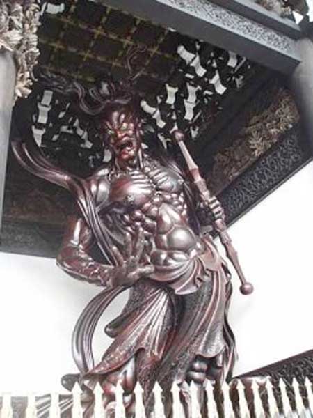 Đôi tượng hộ pháp an vị hai bên Tam quan như đang thúc giục mọi người quay về hành thiện, lánh dữ. Hai tôn tượng này phủ sơn bóng loáng và cũng là những tôn tượng to nhất trên thế giới. Tượng hộ pháp nằm bên cánh phải của Tam quan miệng mỉm cười tượng trưng cho UN (thở vào ); tôn tượng hộ pháp nằm bên cánh trái của Tam quan môi mím lại tượng trưng cho AH (thở ra). Dọc hai bên con đường dẫn vào Chính Điện, ẩn bên trong những hoa viên tuyệt đẹp là Điện thờ Thái tử Thánh Đức (Prince Shotoku Hall). Điện thờ này được nhiều người biết đến như là điện thờ bát giác lớn nhất Nhật Bản. Bên cạnh Điện thờ Thái tử Thánh Đức là bảo tháp 5 tầng, một công trình kiến trúc gỗ sơn phết hoàn hảo nổi bật theo mầu sắc truyền thống tự viện của Nhật Bản.