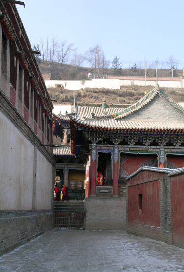 chùa. Phía xa là những nhà sư mặc áo màu đỏ thẫm. |