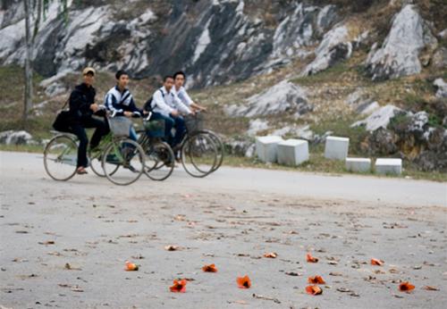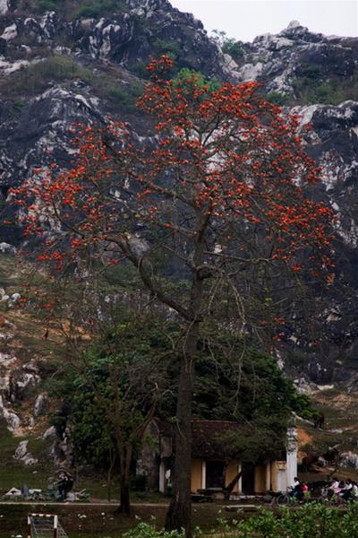Đẹp nhất có lẽ là cây hoa gạo ở gần cây cầu nhỏ, hình dung cổ quái, cành to, cành nhỏ nổi bật trên nền núi đá vôi xám trắng. Hoa gạo rụng nằm lác đác dưới gốc, tản mản vương trên con đường. Một vài đứa trẻ đạp xe ngang, dừng xe chạy xuống nhặt một bông cầm lên tay vơ vẩn. Nam thanh nữ tú cũng dừng xe nhặt bỏ vào giỏ xe vài bông hoa gạo, như mang những đốm lửa nhỏ trên cả chặng đường đi học, về nhà…
