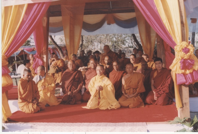 TT. Thích Nhật Từ và tăng đoàn quốc tế chụp hình chung với Đức Tăng vương nhân lễ khánh thành Chùa Thái Lan tại Bồ-đề Đạo tràng, Ấn Độ năm 1997.