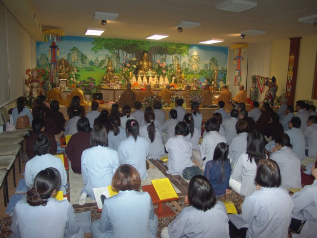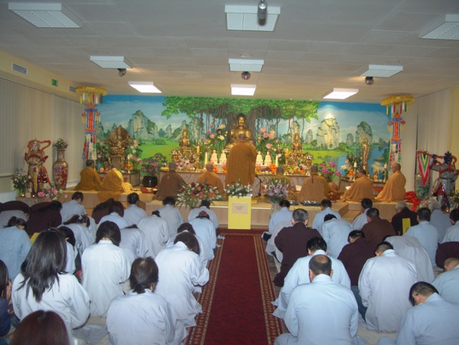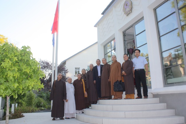 Ngay sau khi vào chùa, đoàn đã tới chính điện lễ Phật, đỉnh lễ Phật uy nghi, hiền từ trong tư thế ngồi giảng pháp dưới cây Bồ đề. Đoàn hoằng pháp không khỏi ngạc nhiên bởi tại nơi xa xứ, còn muôn vàn khó khăn, mà Phật tử nơi đây đã xây dựng được ngôi chùa bề thế là vậy. Đoàn cũng đã đến lễ tại ban thờ tổ, nơi có bức tượng Phật hoàng Trần Nhân Tông và di ảnh các Hòa thượng khai sơn Tổ đình Vĩnh Nghiêm. Bên cạnh nhà tổ là Ban thờ Hùng Vương – Vị vua khai sơn lập quốc của dân tộc Việt Nam, cùng bức tượng Karl Đại đế - Vị vua khai sơn lập Đức quốc, có ảnh hưởng rộng khắp về văn hóa, chính trị và tín ngưỡng tại châu Âu.