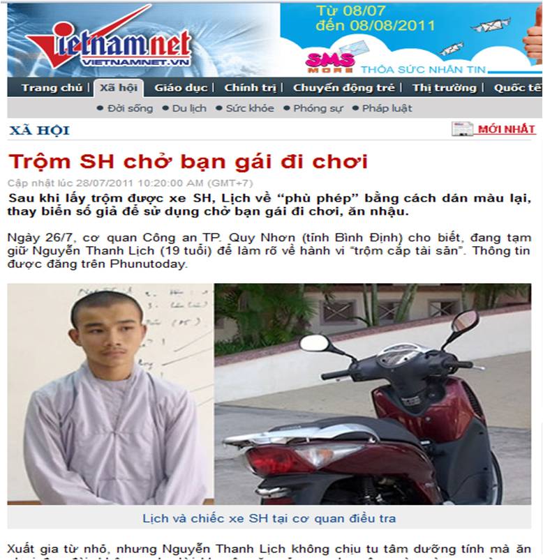 Cũng cần nói thêm, một tờ báo mạng khác là nguoiduatin.vn - Báo điện tử của Báo Đời sống và Pháp luật, đã cho đăng một bài có nội dung tương tự với tựa đề còn trắng trợn hơn "Tạm giữ "sư hổ mang" trộm SH đi chơi với bạn gái".