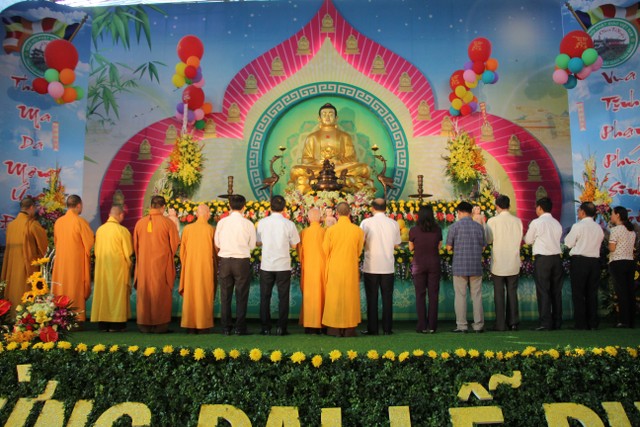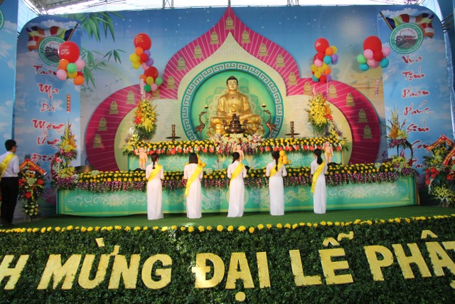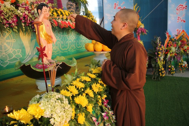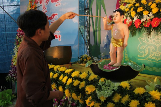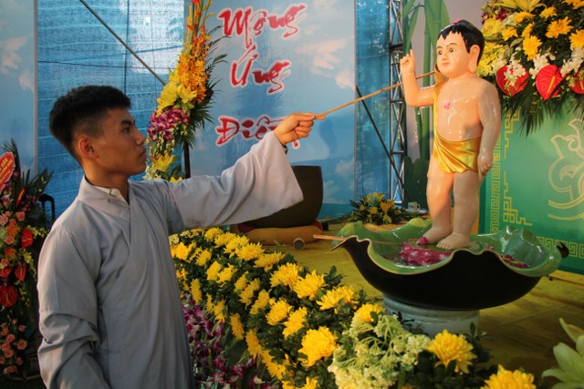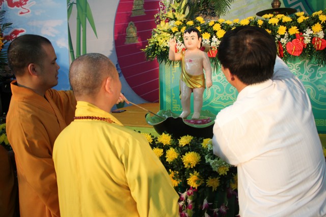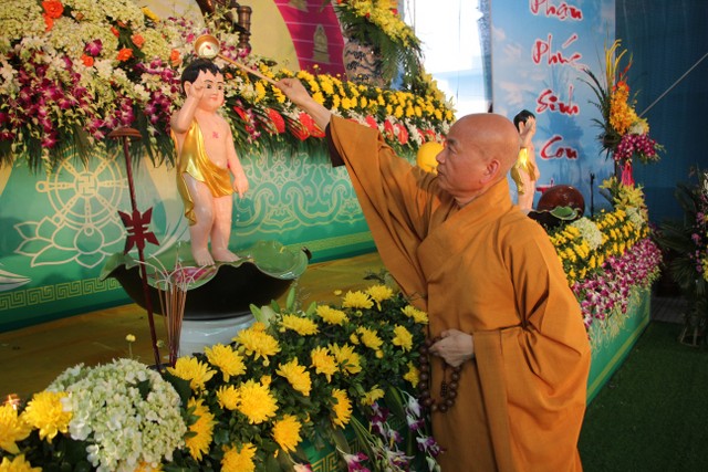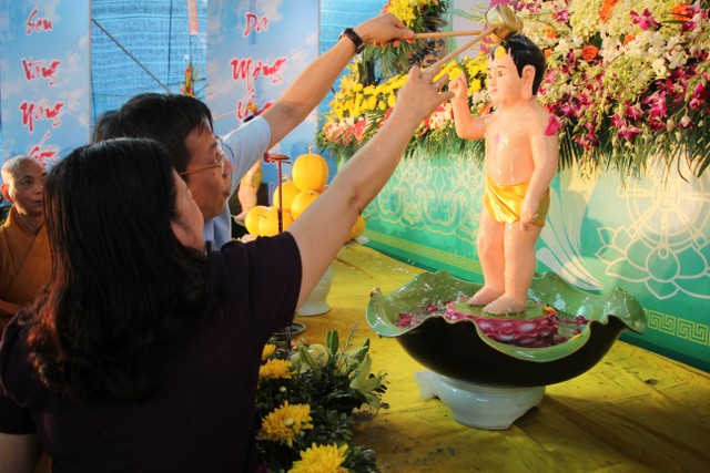 Kết thúc buổi lễ, chư tôn đức, quý vị đại biểu đã dâng hương và cử hành nghi thức tắm Phật trong tinh thần trang nghiêm, thành kính, hòa hợp trong ngày đản sinh của đức Bản sư Thích Ca, thả bóng bay và chim bồ câu nguyện cầu cho thế giới hòa bình, chúng sinh an lạc.