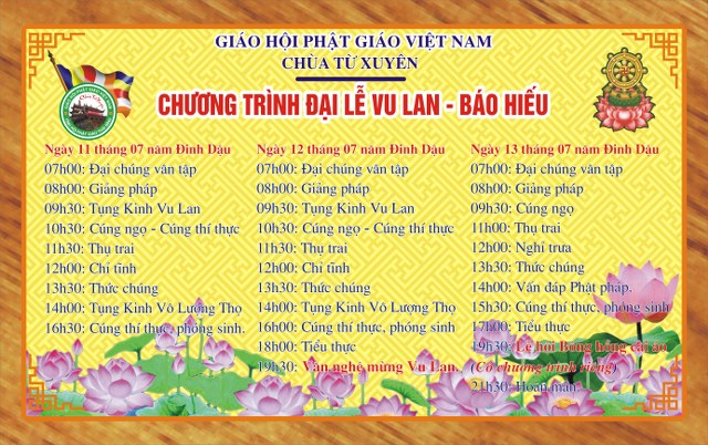 Cũng trong tháng Bảy âm lịch, chùa Từ Xuyên long trọng tổ chức Đại lễ Vu Lan Báo Hiếu vào trong ba ngày: từ 01-03/09/2017 (nhằm 11-13/07/Đinh Dậu). Đại lễ không ngoài mục đích hướng mọi người sống trong tinh thần hiếu hạnh của người con Phật, noi theo gương hiếu của Ngài Mục Kiền Liên nhằm đền trả phần nào công ơn của Tam Bảo, ông bà, cha mẹ trong muôn một, hồi hướng phúc lành trong mùa Báo hiếu năm nay.
