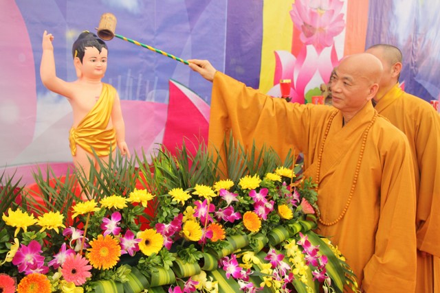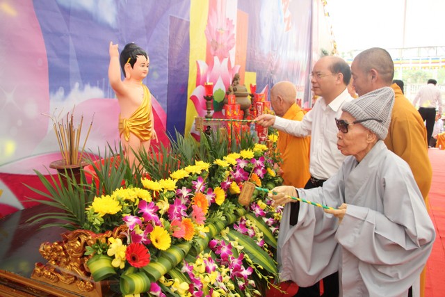 Kết thúc buổi lễ, chư tôn đức, quý vị đại biểu đã làm nghi thức cắt băng khánh thành chính điện chùa Sùng Nghiêm, dâng hương và cử hành nghi thức tắm Phật trong tinh thần trang nghiêm, thành kính, hòa hợp trong ngày đản sinh của đức Bản sư Thích Ca.