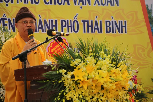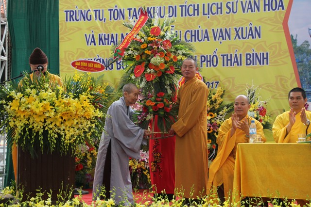 Trong niềm hoan hỷ của buổi lễ, TT.Thích Trí Sử, Trưởng BTS PG TP.Thái Bình cũng đã có đôi lời huấn từ động viên Ni trưởng và Phật tử bản tự. Thượng tọa nhấn mạnh tâm nguyện của người xuất gia: “Thượng cầu Phật đạo, hạ hóa chúng sinh”. Do đó, thầy mong rằng Ni trưởng cùng Phật tử chùa Vạn Xuân sẽ tổ chức nề nếp các hoạt động Phật sự, làm cho ngôi chùa luôn trang nghiêm, tố hảo, thực hiện nếp sống văn minh. Nhân dịp này, Ni trưởng trụ trì đã bày tỏ niềm tri ân sâu sắc đối với các cấp Giáo hội, chính quyền các cấp, các mạnh thường quân, các nhà tài trợ, Phật tử thập phương đã đóng góp nhiều tịnh tài, tịnh vật, ngày công để công trình được hoàn thành, khang trang như ngày hôm nay.