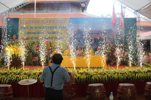 Thay mặt ban quản lý di tích, bà Tô Thị Bình, Chủ tịch UBND P.Bồ Xuyên phát biểu khai mạc buổi lễ. Theo đó, chùa Vạn Xuân (P.Bồ Xuyên, TP.Thái Bình) là di tích lịch sử văn hóa cấp tỉnh, tọa lạc trên đường Trần Thái Tông với địa thế giao thông thuận lợi. Chùa làng Bồ Xuyên được xây từ nhiều thế kỷ trước, trải qua nhiều thăng trầm của lịch sử, thiên tai và chiến tranh, chùa đã xuống cấp trầm trọng. Năm 2008, được sự tu vấn thiết kế của HT.Thích Thanh Nhã, UVTT HĐTS TƯGH, Phó BTS PG TP.Hà Nội, trụ trì chùa Trấn Quốc; sự giúp đỡ của các cấp chính quyền, các ban ngành đoàn thể và sự hảo tâm công đức của quý đạo hữu thập phương Phật tử, Ni trưởng trụ trì Thích Đàm Cầm cùng ban khánh thiết và nhân dân tín đồ đã phát tâm xây dựng ngôi Đại hùng Bảo điện để đáp ứng nhu cầu tu học Phật pháp cũng như nhu cầu tín ngưỡng của nhân dân. Trải qua gần 10 năm thi công, ngôi Đại hùng Bảo điện cùng một số công trình phụ trợ đã được hoàn thiện thành với tổng kinh phí trên 20 tỷ đồng. Các hạng mục công trình của chùa đảm bảo kỹ, mỹ thuật, mang đậm bản sắc kiến trúc chùa miền Bắc. Các mảng chạm trổ, điêu khắc, trang trí nội thất dựa theo họa tiết, hoa văn thời Lý Trần. Đặc biệt, ngôi Bảo Điện được thiết kế quy mô lớn, với kiến trúc bằng gỗ, hình chữ công, năm gian bái đường, ba gian hậu cung, lợp ngói mũi hài, nền cao 1,5 m; chiều cao từ mặt nền nên đến nóc là 11m, rộng trên 300 m2. Nhà thờ Tổ có kiến trúc hai tầng, tầng trên thờ Tổ, tầng dưới là nhà khách. Đến năm 2016, chùa tiếp tục xây dựng cổng Tam quan với kinh phí trên 1 tỷ đồng.