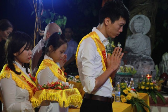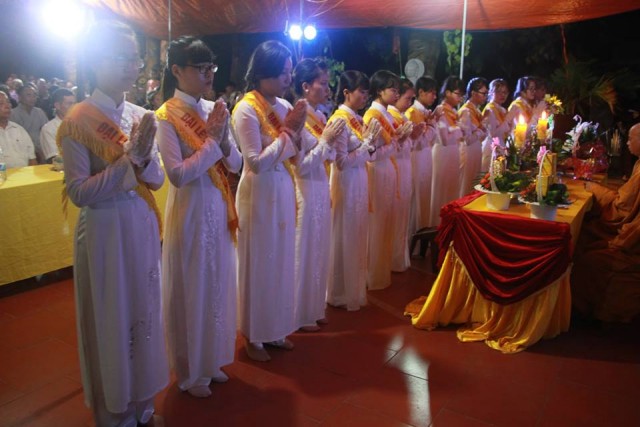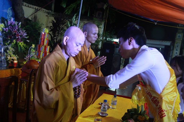 Tiếp sau đó, noi theo tấm gương hiếu của Ngài Mục Kiền Liên, các bạn thanh niên Phật tử đã thay mặt đại chúng thành kính dâng pháp y cúng dường hiện tiền chư tôn thiền đức. Đạo từ cho buổi lễ, Thượng tọa Thích Thanh Định, trụ trì chùa Từ Xuyên đã thay mặt chư Tăng hiện diện tán thán tinh thần hiếu tâm hiếu hạnh của toàn thể quý Phật tử và hứa khả nạp thọ phẩm vật cúng dường. Thượng tọa cũng đã có đôi lời khuyến tấn đại chúng cần làm tròn hiếu đạo của người con Phật để mỗi ngày đều là ngày lễ Vu Lan – Báo hiếu.