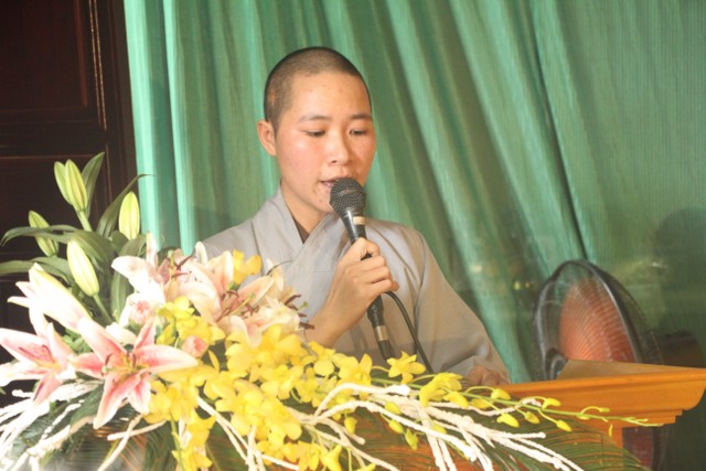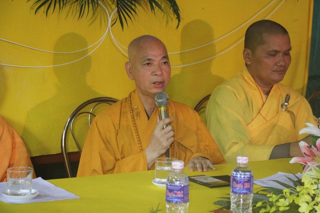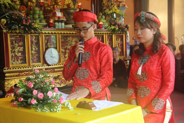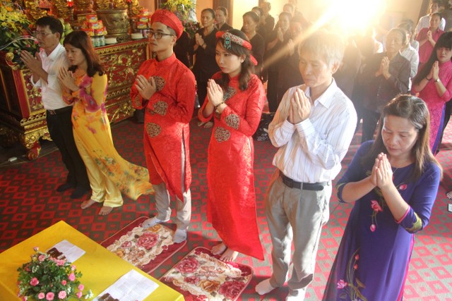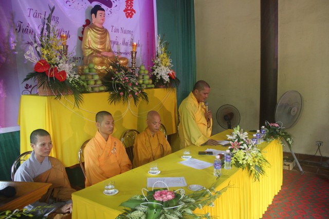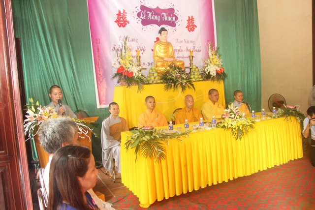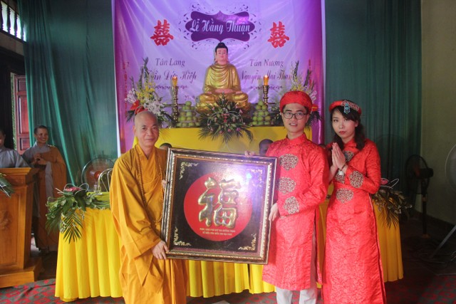 Trong không khí trang nghiêm, thành kính, chư tôn đức đã niêm hương bạch Phật, trì chú cầu nguyện và làm lễ quy y Tam Bảo để hai bạn lấy đó làm kim chỉ nam cho cuộc sống gia đình. Các bạn đã đối trước Tam Bảo lễ tạ tứ ân; đỉnh lễ công ơn sinh thành, dưỡng dục của song thân; đỉnh lễ tôn trọng sự bình đẳng của nhau. Sau đó, đích thân Thượng tọa chứng minh trao nhẫn và trao quà cưới cho hai bạn. Trong niềm hoan hỷ của buổi lễ, quý Thầy đã khuyến tấn tân lang, tân nương phải sống trọn vẹn bổn phận làm vợ và làm chồng, làm dâu hiền, rể thảo cùng xây dựng gia đình theo tinh thần kinh Thiện Sinh. Đặc biệt quý thầy chia sẻ bí quyết để có một cuộc sống hạnh phúc dựa trên sự hiểu biết, thương yêu và thực hành năm giới dành cho người Phật tử tại gia.