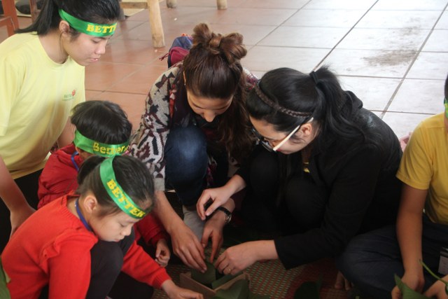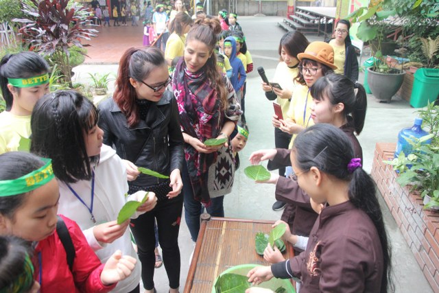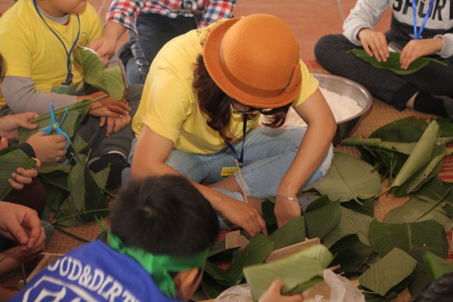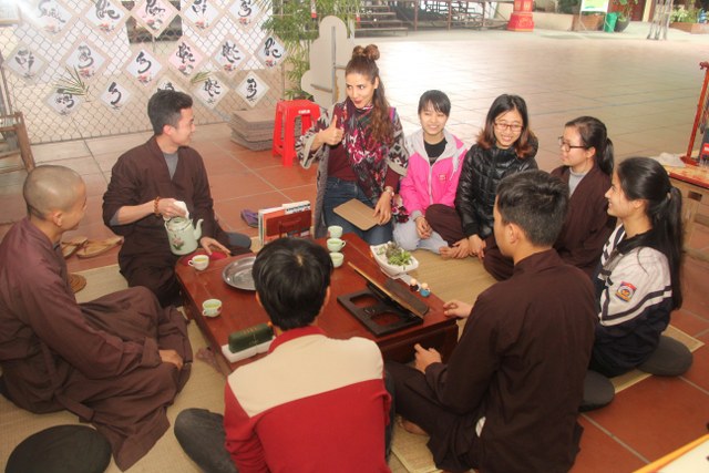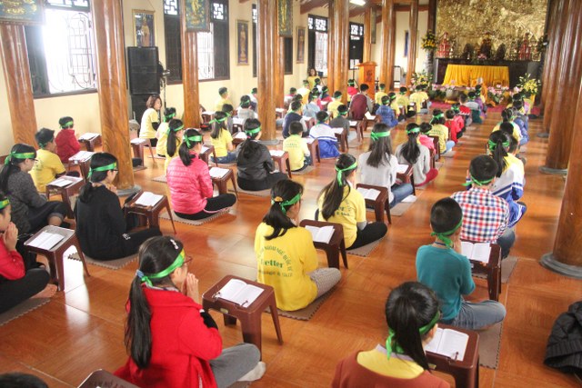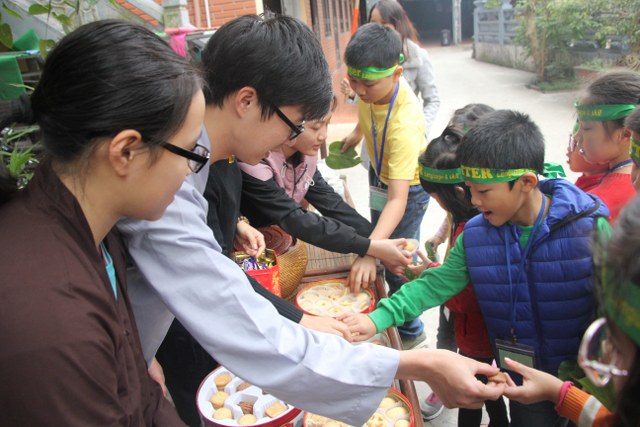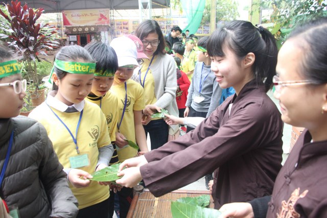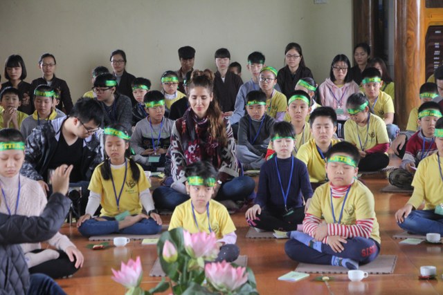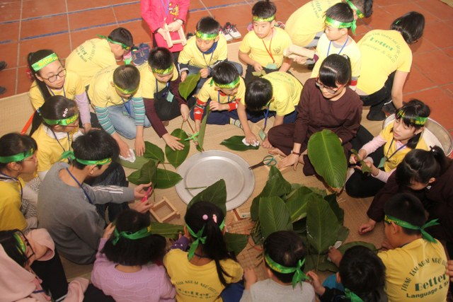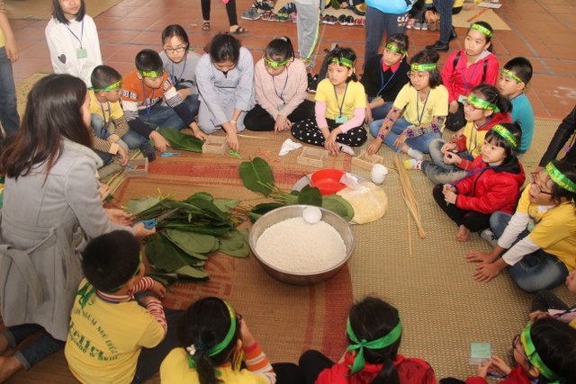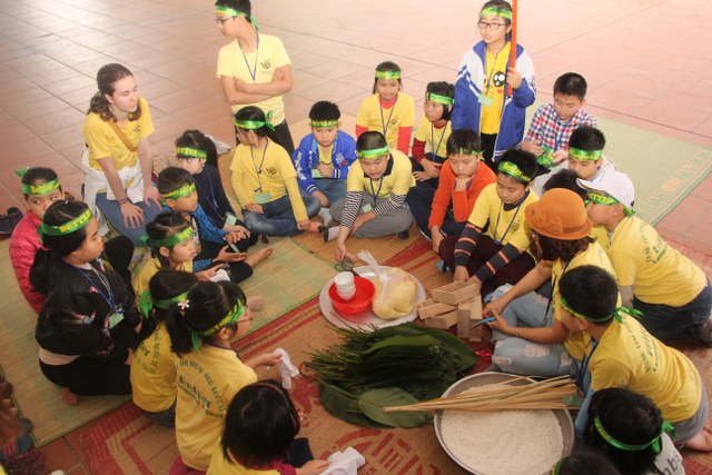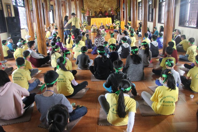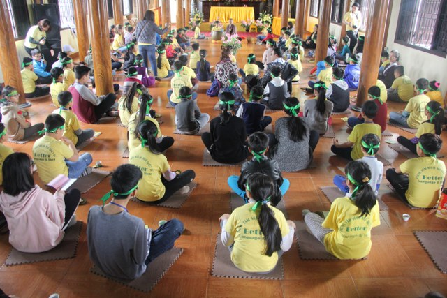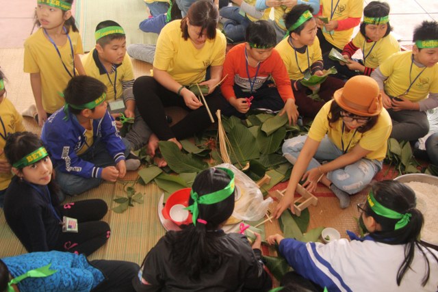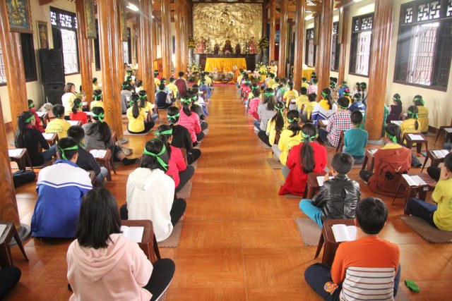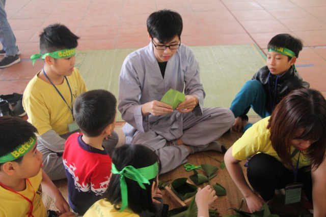 Trong thời gian buổi sáng, các bạn trẻ được các Thầy cô giáo tỉ mỉ hướng dẫn gói bánh chưng chay tại chùa từ việc đơn giản nhất như lau lá, cắt gấp lá. Có lẽ đây là lần đầu tiên các em nhỏ làm quen với công việc này. Sau đó, quý Thầy đã tổ chức cho các bạn làm quen với không khí tu học ở chùa qua nghi thức thiền trà và các bài thiền ca. Việc kết hợp lời hát tiếng Anh và tiếng Việt của bài hát “Ta hạnh phúc liền giây phút này” làm các bạn thêm hứng thú. Bên cạnh đó, các bạn còn được quý Thầy hướng dẫn ăn cơm khất thực với các món ăn chay vì lòng từ bi không giết hại chúng sinh; tụng hai mươi lời nhớ ơn và bài học “Phép tắc người con”. Cuối ngày tu học, các bạn được các giáo viên tổ chức các trò chơi dân gian.