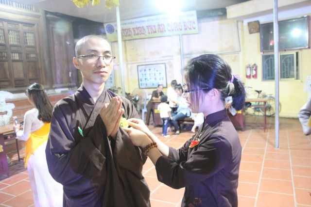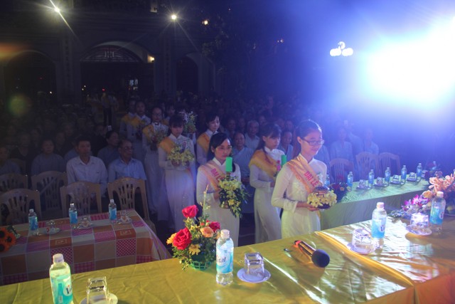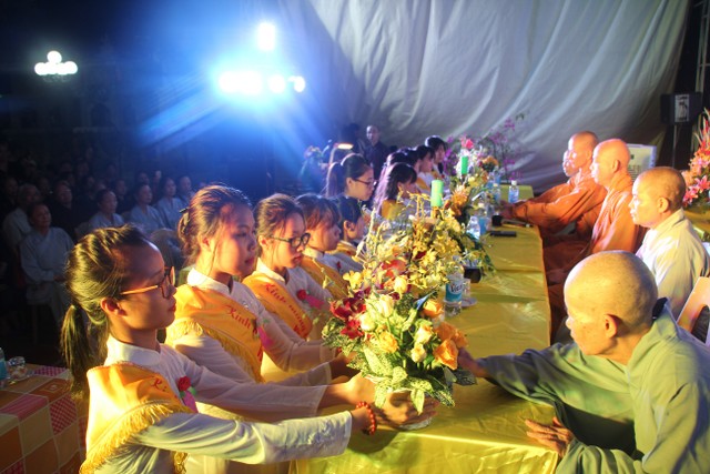 Toàn thể đại chúng vô cùng xúc động khi nghe diễn đọc ý nghĩa cài hoa hồng và hoài niệm về những ngày thơ bé bên cha mẹ. Sau đó, các bạn trẻ đã cài hoa hồng kính dâng chư tôn đức, tặng quý vị khách quý cùng nhân dân Phật tử trong niềm cảm thương dâng trào về người cha, người mẹ khả kính.