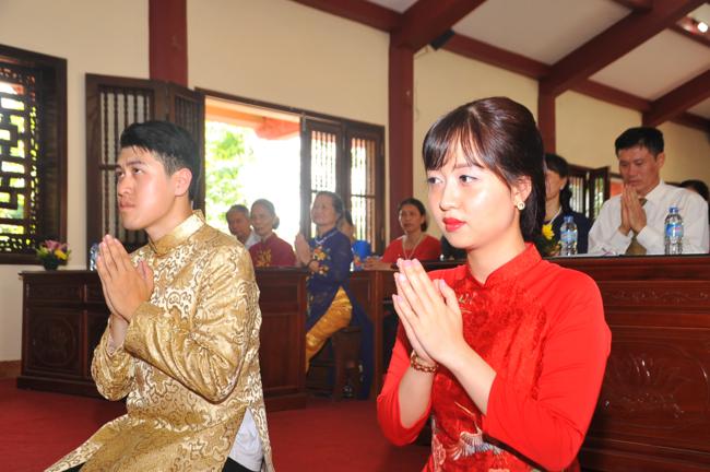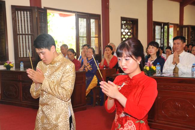 Dưới sự gia hộ của mười phương chư Phật, sự chứng minh của: Hòa thượng trụ trì Thích Bảo Nghiêm; Thượng tọa Thích Thanh Định - Ủy viên HĐTS TW GHPGVN, Phó trưởng Ban thường trực BTS GHPGVN tỉnh Thái Bình; Đại đức Thích Thanh Vượng - Phó BTS GHPGVN tỉnh Thái Bình, Trưởng BTS GHPGVN huyện Kiến Xương cùng quý chư tôn đức Tăng đến từ các chùa, tự viện và sự tham dự của họ hàng hai bên gia đình, đôi bạn trẻ đã kết duyên vợ chồng.