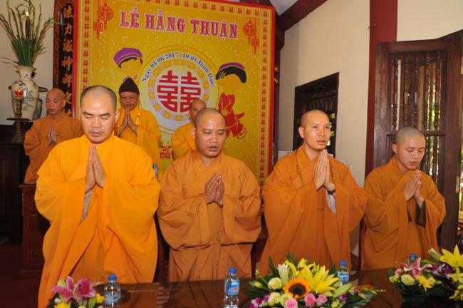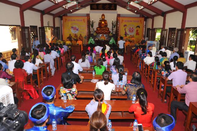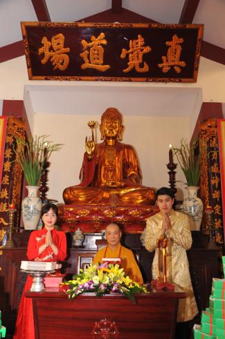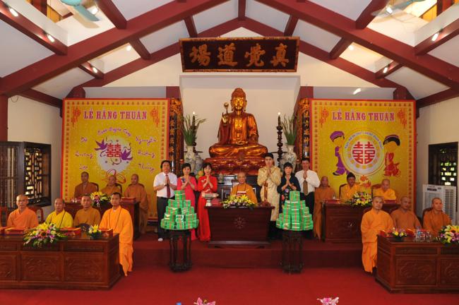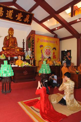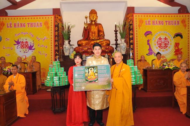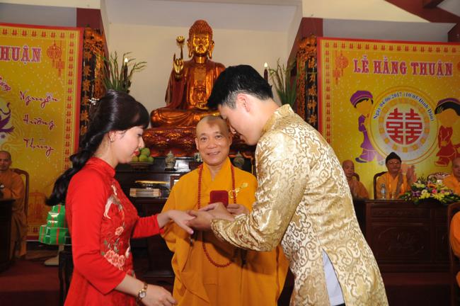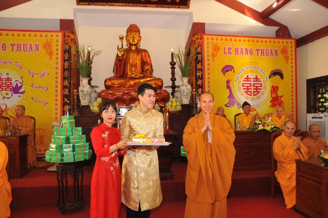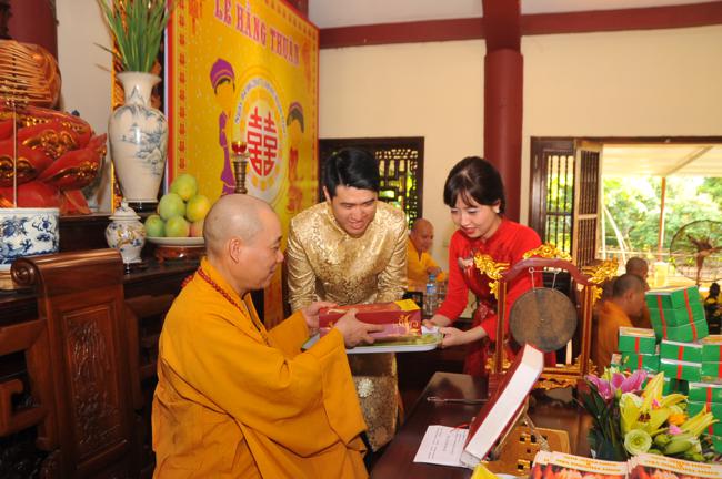 Trước khi cử hành nghi lễ hằng thuận, đôi bạn trẻ đã được Hòa thượng trụ trì cùng chư Tăng tác pháp quy y Tam Bảo và trao truyền Ngũ Giới để làm kim chỉ nam cho cuộc sống hiện tại.