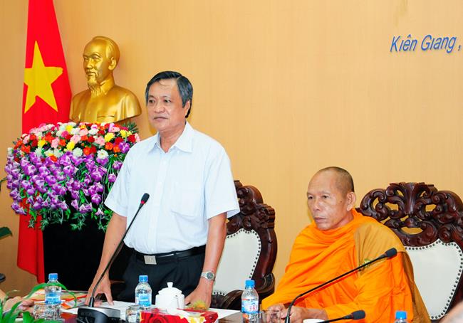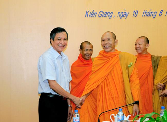 Thân mật đón tiếp đoàn có ông Phạm Vũ Hồng, Phó Bí thư Tỉnh ủy, Chủ tịch UBND tỉnh Kiên Giang; ông Lâm Hoàng Sa, Trưởng ban Dân vận Tỉnh ủy; Thiếu tướng Bùi Tuyết Minh, Giám đốc Công an tỉnh; ông Nguyễn Hoàng Oanh, Phó Giám đốc Sở Nội vụ, Trưởng ban Tôn giáo tỉnh; Ông Danh Phúc phó chủ tịch Thường trực UBMTTQVN Tỉnh và đại diện các cơ quan, ban ngành trong tỉnh.