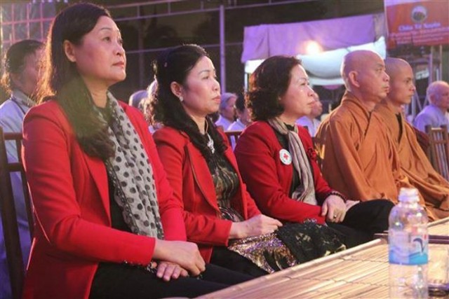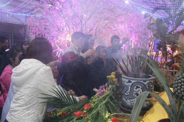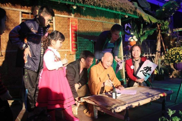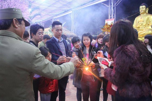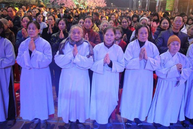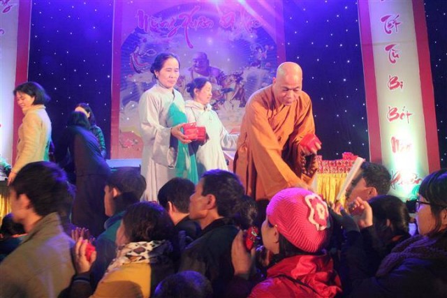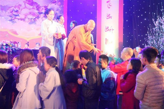 Tiếp đó là những tràng pháo tay dòn dã, những màn pháo sáng rực đón chào một mùa xuân mới đã về. Một phần không thể thiếu trong đem giao thừa đó chính là nhận phần quà pháp bảo từ thượng tọa trụ trì, dòng người cất cao tiếng niệm phật và lần lượt đến nhận lộc đầu xuân trong niềm hoan hỉ và an lạc.