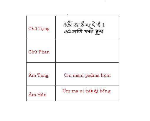 Nay xin đem sáu chữ bằng Phạn ngữ, Hán ngữ và Tạng ngữ đối chiếu với biểu đồ sau: