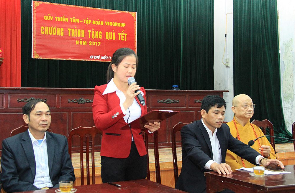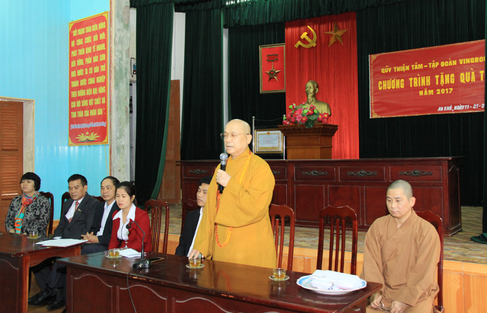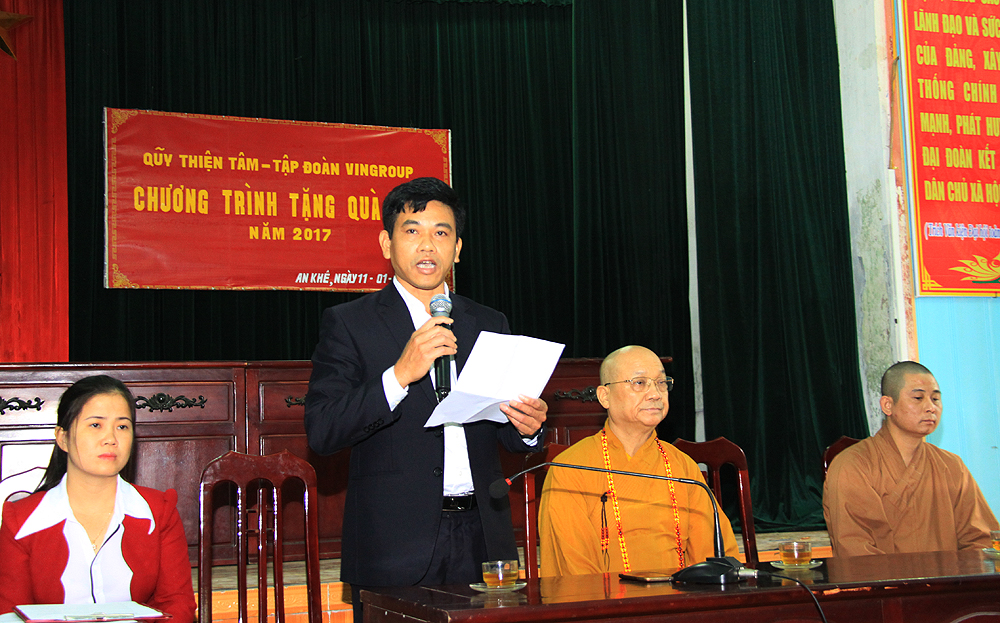 Đại diện chính quyền địa phương, ông Lê Đắc Vụ, Chủ tịch UBND xã An Khê phát biểu, cảm ơn HT.Thích Thanh Nhã cùng quỹ Thiện Tâm - Vingroup đã trao quà Tết cho các gia đình chính sách, gia đình nghèo của địa phương, đây là hoạt động rất ý nghĩa, thể hiện tinh thần từ bi cứu khổ của đạo Phật và “tương thân tương ái, lá lành đùm lá rách”, "thương người như thể thương thân" theo truyền thống tốt đẹp của dân tộc Việt Nam. Ông hy vọng sẽ tiếp tục nhận được sự quan tâm, giúp đỡ của Hòa thượng và quỹ Thiện Tâm - Vingroup trong thời gian tới.