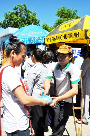 Tại cổng trường, chúng tôi bất ngờ với hình ảnh một thanh niên với đôi nạng gỗ trên tay chạy tới chạy lui trao tận tay đến cho thí sinh những suất cơm chay miễn phí. Anh Quang tâm sự: “Đây là đợt thứ hai của kỳ thi ĐH năm nay mình cùng các phật tử của Hội Phật giáo Tam Kỳ tình nguyện giúp đỡ các bạn thí sinh, cho dù đôi chân của mình không lành lặn như các tình nguyện viên khác, đi lại khó khăn nhưng mình vẫn cố gắng trao tận tay những suất cơm chay đến với thí sinh.”