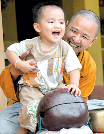 | Sư thầy Thích Chiếu Pháp với bé Tiến. Câu chuyện của họ đích