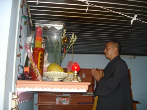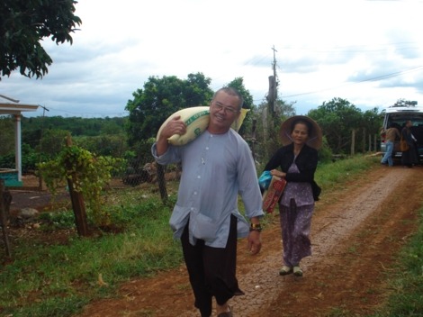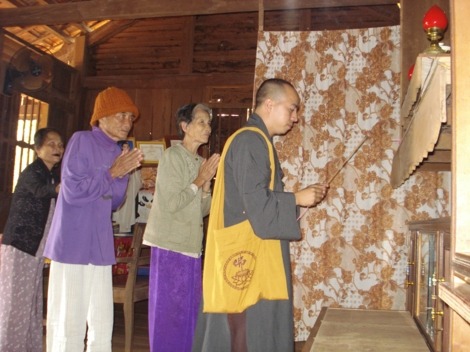 Thầy tranh thủ qua thăm và cho quà  vài hộ gia đình gần nhà dì Gái   .  Mấy hộ này chưa thờ Phật và cũng chưa biết đạo . Thầy ân cần hỏi han về đời sống và cho địa chỉ chùa , đồng thời mời họ bất cứ lúc nào thầy cũng sẳn sàng đón họ về với đạo Phật  . Tôi  bỗng thấy giửa thầy và họ như đã kết duyên lành từ thuở nào   . Như tâm đã truyền tâm .