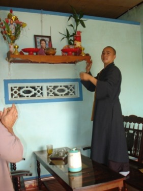 Dì Gái đi đâu đó qua hàng xóm . Trong lúc chờ dì về ,  thầy thắp nhang lên bàn thờ Phật  . Thầy tấm tắc khen nhà dì Gái tuy đơn sơ , nghèo nhưng ấm cúng , thờ phượng trang nghiêm  .  Thầy chỉ lên bức vách bằng gỗ đã ố màu thời gian cho mọi người xem ,  hơn 10 lá phái quy y của gia đình dì Gái cả con lẫn cháu  được treo ngay ngắn  . Thầy nói :  “ các vị hãy noi theo tấm gương Phật Hóa Gia Đình của cô Nhuận Thiện nghe  ” .
