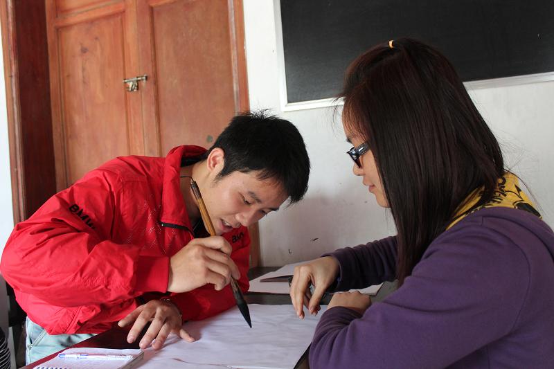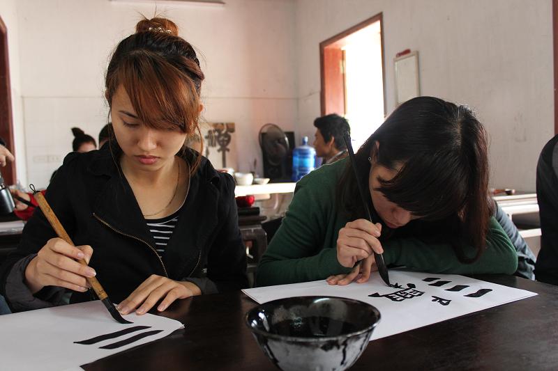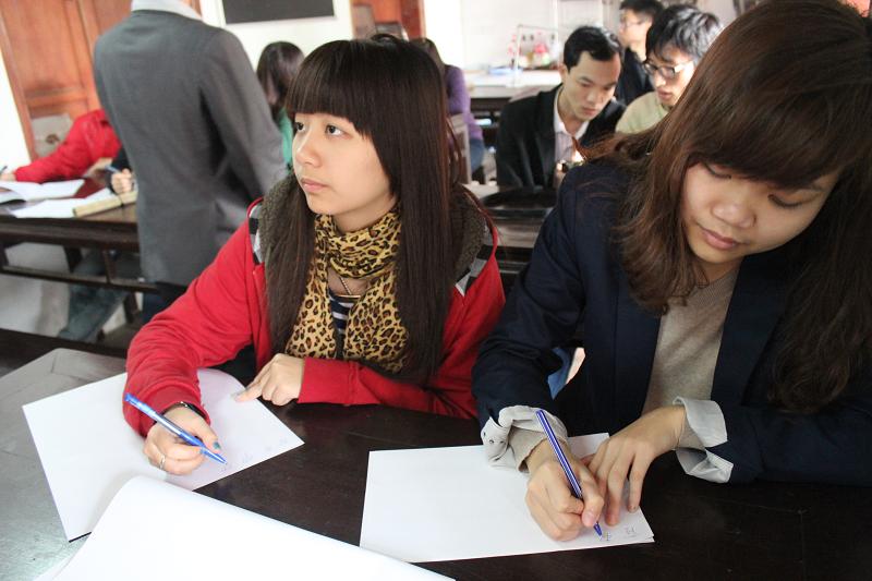 Các học viên mới được học viên cũ chỉ dẫn tận tình từ cách cầm bút