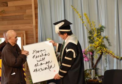 Kết thúc buổi đối thoại, Thầy Làng Mai tặng quà lưu niệm cho Đoàn đại biểu của Đại học Hồng Kông bằng bức thư pháp "Happy teachers will change the world" (Thầy cô giáo hạnh phúc sẽ làm thay đổi thế giới). Mặc dù chỉ thăm Làng Mai được một ngày thôi nhưng đoàn đại học Hồng Kông đã có cơ hội thưởng thức rất nhiều "đặc sản" của Làng như thiền hành, thiền tọa, thiền trà, ăn cơm im lặng,...và đặc biệt hơn cả là không khí đầm ấm của một gia đình tâm linh. Có lẽ đây là lần đầu tiên các thành viên trong đoàn được chứng kiến một buổi lễ trao bằng Tiến sĩ danh dự trong không khí ấm áp và thân tình đến vậy. Đúng như lời của Thầy Làng Mai: "Chúng tôi không hoạt động như một cá nhân mà luôn hoạt động như một Tăng thân. Vì vậy, vinh dự lớn lao này cũng thuộc về mọi thành phần của tăng thân".