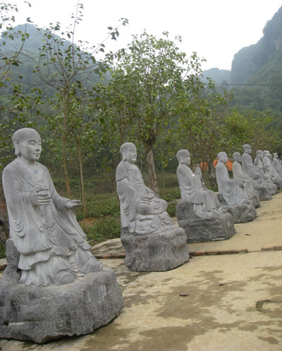 Quần thể kiến trúc rộng hơn 500 ha nhộn nhịp tiếng bước chân người đi lại. Từng đoàn du khách nối đuôi nhau theo chân hướng dẫn viên dâng hương, thăm quan cổng Tam Quan, điện Quan Âm, tháp Chuông đồng, hang sáng… Tại hành lang La Hán, chị Đào Thị Tuyết Mai, ở thành phố Phủ Lý, đang chăm chú lắng nghe hướng dẫn viên thuyết minh về 500 tượng La Hán cao 2,5m đặt dọc theo hành lang, kéo dài tới tận đỉnh núi. Mỗi vị La Hán mang một vẻ khác nhau, miêu tả sự sống nơi trần thế.