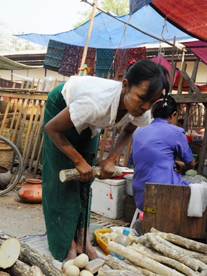 Chúng tôi chọn cái chợ lớn nhất địa phương để thăm thú. Dân cư ở đây nom cứ như người cổ. Thiếu nữ và trung niên, bà lão vẽ lên gò má những vòng phấn làm bằng vỏ và thân cây - gọi là Thanaka, lối trang sức cực thịnh ở Myanmar.