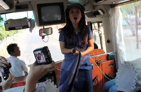 Hướng dẫn viên du lịch đang dạy du khách cách quấn long y. Cô cho biết, một ngày đàn ông Myanmar quấn lại long y tầm 30 lần.