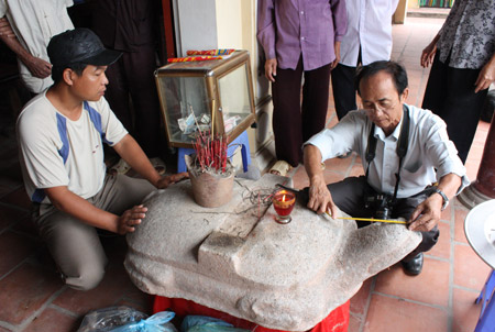 PGS.TS Nguyễn Lân Cường đang nghiên cứu nhằm xác định niên đại của rùa đá ở chùa Duyên Khánh.