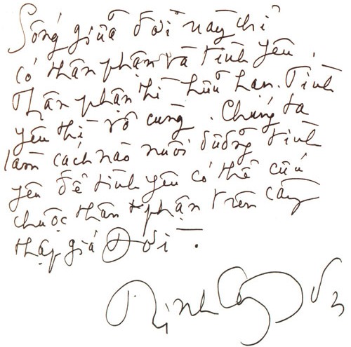 Trịnh Công Sơn đã thênh thang “một cõi đi về”. Cái ông để lại không là hơi ấm tâm linh, niềm an ủi dặn dò của một Phật tử dành cho bao người đã đến và sẽ đến trần gian này làm người. Nó là những lời thì thầm dấu yêu, những khúc thơ đau thương về thân phận kiếp người, cái đẹp muôn đời mà con người có đầy đủ tư cách cất mình vươn tới.