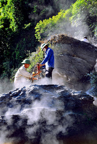 Công đoạn tìm những khối đá trên núi đối với người thợ đá Ninh Vân rất vất vả và nguy hiểm. Những khối đá ở dãy núi đá vôi Tam Điệp dùng để tạc tượng phải là đá xanh nguyên khối có độ gắn kết cao.