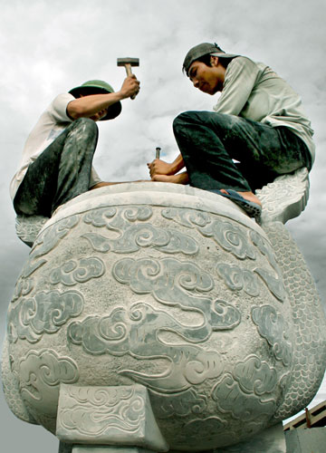 Bắt đầu từ đây, những khối đá vuông thành sắc cạnh ấy được các nghệ nhân làm tỉ mỉ từng công đoạn, tạo hình khối tượng rồi tỉa tót hoa văn.