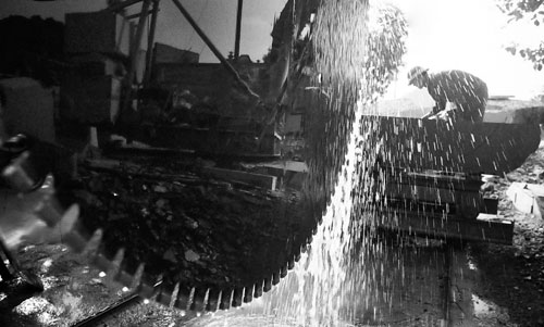 Khi chọn được những khối đá ưng ý phải dùng máy cắt để tạo thành những khối đá vuông thành sắc cạnh.