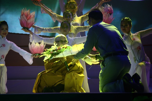Hòa thượng cũng thay mặt cho THPG TP. HCM trao lẵng hoa tươi thắm chúc mừng những đóng góp của Ban Văn hóa dành cho những sự kiện trọng đại và ý nghĩa trong mùa Phật đản.
