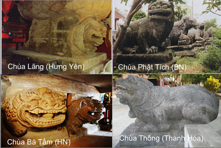 Tượng 2 con sư tử đá ở chùa Bà Tấm (Hà Nội). Tượng sư tử đội tòa sen chùa Hương Lãng (Hưng Yên), chùa Ngô Xá (Nam Định), chùa Kim Hoàng và chùa Thầy (Hà Tây). Sấu đá chùa Quỳnh Lâm (Quảng Ninh)...