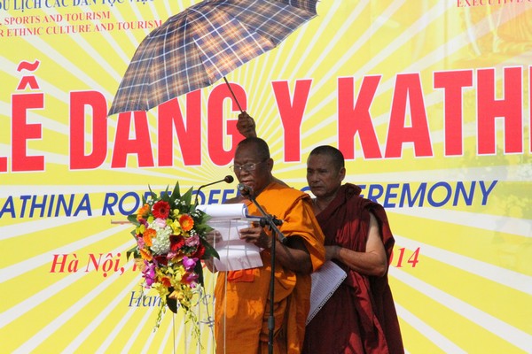 Thay mặt lãnh đạo chính quyền ông Bùi Thanh Hà phát biểu: Lễ dâng Y Kathina là một nghi lễ thiêng liêng, quan trọng của Phật giáo Nam tông Khmer. Đây không chỉ là dịp để mỗi tín đồ Phật giáo Nam tông Khmer bày tỏ lòng kính ngưỡng Tam bảo, dâng kính lên người Thầy của mình những vật phẩm với cả tấm lòng thành kính và tôn trọng mà còn là dịp người Phật tử được báo ân về các bậc tổ tiên. Nhi thức Dâng y đã trở thành nét văn hóa truyền thống đặc biệt đối với người dân Khmer. Điều đó càng ý nghĩa hơn khi lần đầu tiên tại Thủ đô Hà Nội ngàn năm văn hiến, nghi thức Dâng y của Phật giáo Nam tông Khmer được Tăng Ni, tín đồ Phật giáo Nam tông Khmer tái hiện một cách long trọng, trang nghiêm và đầy đủ, chân thực tại chính ngôi chùa Nam tông với không gian đậm bản sắc Khmer mới xây dụng tại Thủ đô Hà Nội.